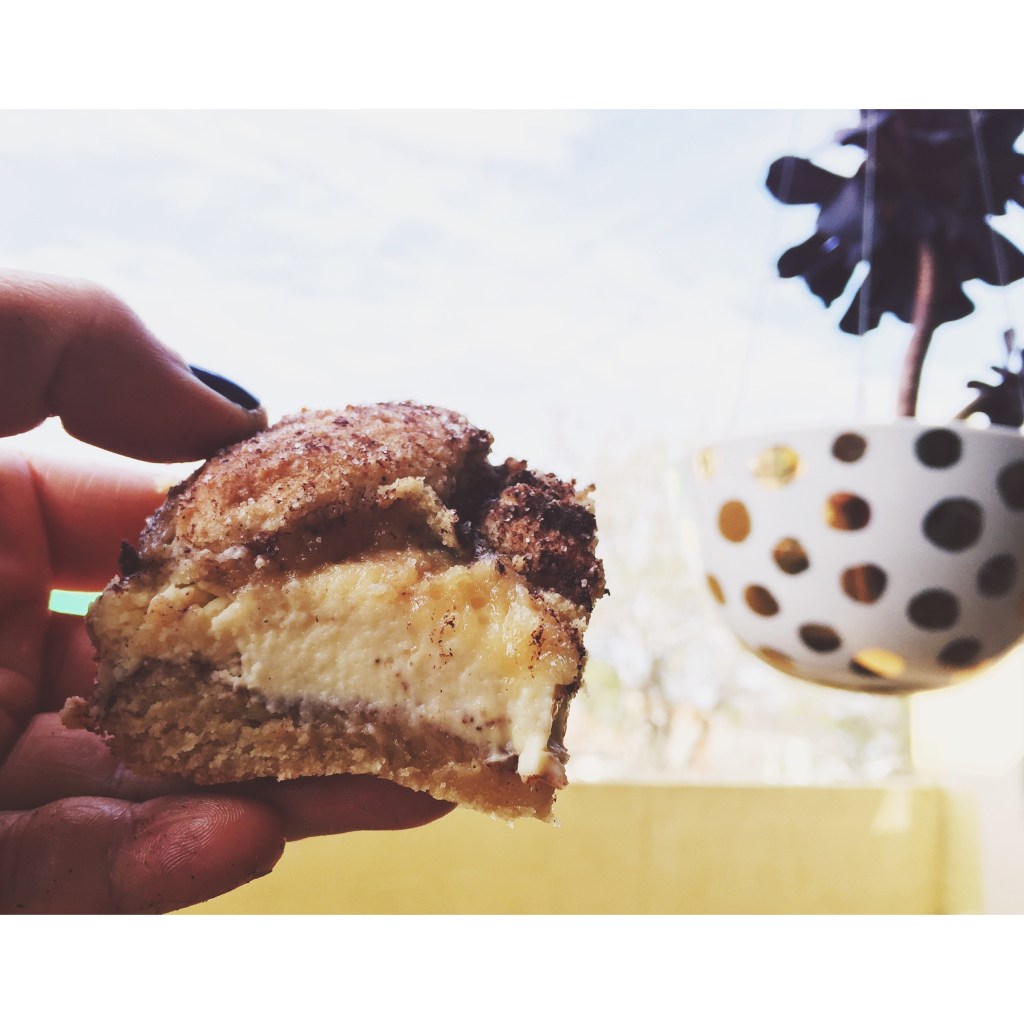 When I made these for the first time, I had one bite and then half of the pan was gone by the time I regained consciousness. These are quite dense, but pair it with a glass of milk and it’ll all balance out. The crunch from the cookie crumble and the creamy consistency of the cheesecake creates a wondrous texture in a bite. If you wanted to make this as a cheesecake and not as bars, just pour the batter into a different vessel (springform pan rather a brownie pan) and there you have it. You can also forgo the crumble on top, but why would you?